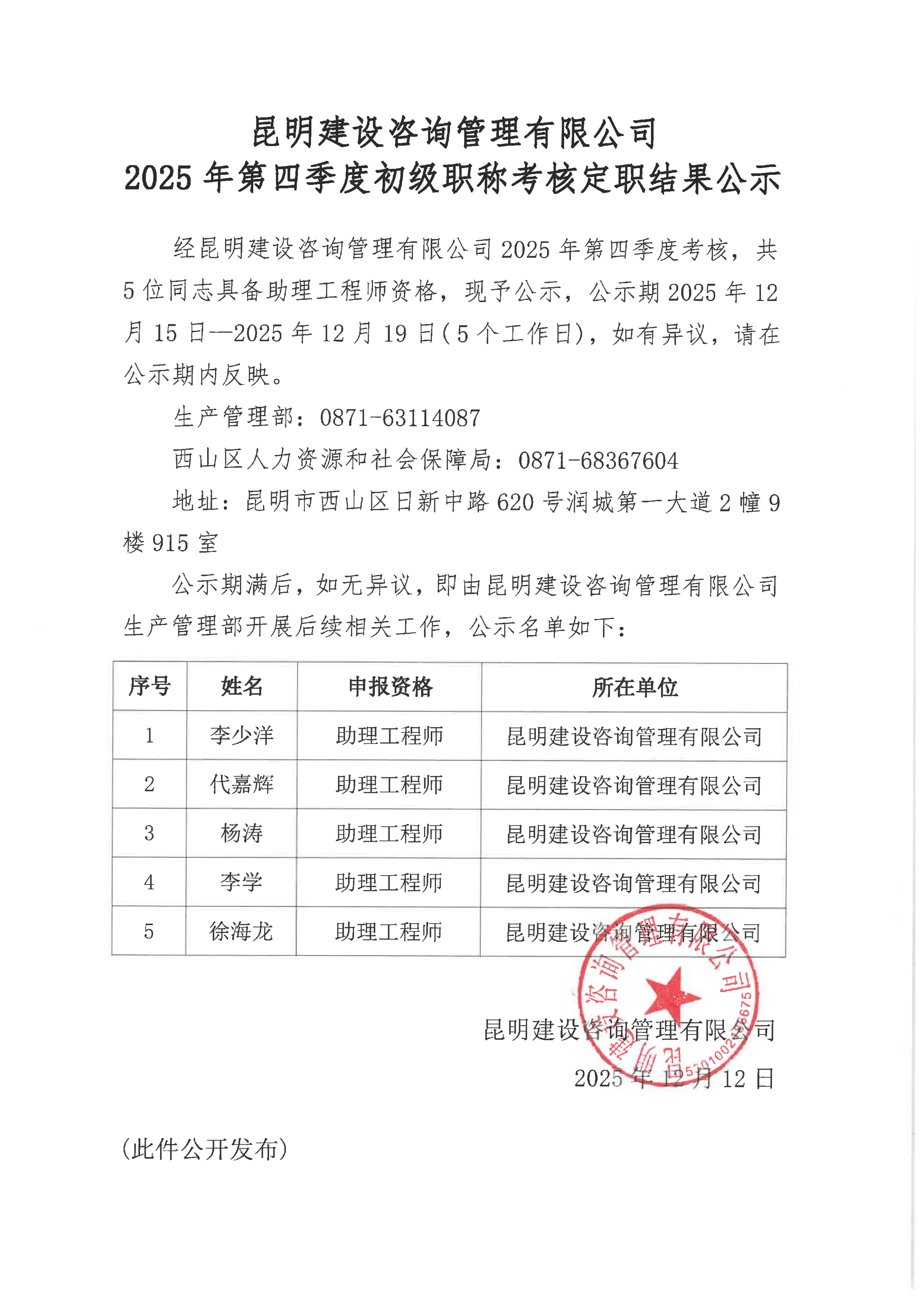 昆明建设咨询管理有限公司 2025年第四季度初级职称考核定职结果公示